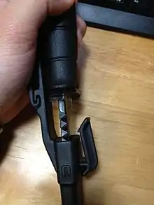 The grips and sheaths of both knives are made of Glock polymer. The grip material has a lower hardness than the polymer used in Glock pistols, avoiding possible problems due to brittleness, but it is also less scratch-resistant. The handle of the Glock field knives was originally available in the colours olive drab, black, gray and desert sand,[6] and currently (2021) in olive drab (international name "battle field green"), black, gray and brown (international name "flat dark earth"). The upper crossguard is bent forward to allow the knife to be used as a bayonet on the Steyr AUG rifle.[7] It can be used as a bottle opener.