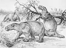 Glossotherium is an extinct genus of large mylodontid ground sloths of the subfamily Mylodontinae. It represents one of the best-known members of the family, along with Mylodon and Paramylodon. Reconstructed animals were between 3 and 4 metres (9.8 and 13.1 ft) long and possibly weighed up to 1700 kg. The majority of finds of Glossotherium date from the Middle and Upper Pleistocene, around 300,000 to 10,000 years ago, with a few dating older, as far back Pliocene, about 3.3-3 million years ago.[2] The range included large parts of South America, east of the Andes roughly from latitude 20 to 40 degrees south, leaving out the Amazon Basin in the north. In western South America, finds are also documented north of the equator. The animals largely inhabited the open landscapes of the Pampas and northern savanna regions.