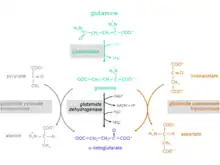 The conversion of the amino acid glutamine to α-ketoglutarate takes place in two reaction steps: