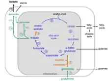 Glutaminolysis takes place in all proliferating cells,[22] such as lymphocytes, thymocytes, colonocytes, adipocytes and especially in tumor cells.[1][2][3][4][5][6][7][8][10][11][12][13][14][16][18][19][23] Glutaminolysis has been targeted for therapeutic purposes.[21] In tumor cells the citric acid cycle is truncated due to an inhibition of the enzyme aconitase (EC 4.2.1.3) by high concentrations of reactive oxygen species (ROS)[24][25] Aconitase catalyzes the conversion of citrate to isocitrate. On the other hand, tumor cells over express phosphate dependent glutaminase and NAD(P)-dependent malate decarboxylase,[9][26][27][28][29] which in combination with the remaining reaction steps of the citric acid cycle from α-ketoglutarate to citrate impart the possibility of a new energy producing pathway, the degradation of the amino acid glutamine to glutamate, aspartate, pyruvate CO2, lactate and citrate.