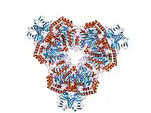 Glycoside hydrolases EC 3.2.1. are a widespread group of enzymes that hydrolyse the glycosidic bond between two or more carbohydrates, or between a carbohydrate and a non-carbohydrate moiety. A classification system for glycoside hydrolases, based on sequence similarity, has led to the definition of >100 different families.[1][2][3] This classification is available on the CAZy web site,[4][5] and also discussed at CAZypedia, an online encyclopedia of carbohydrate active enzymes.[6][7]