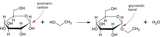 A glycosidic bond is formed between the hemiacetal or hemiketal group of a saccharide (or a molecule derived from a saccharide) and the hydroxyl group of some compound such as an alcohol. A substance containing a glycosidic bond is a glycoside.