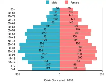 According to the 2011 Poland census, there were 7,904 people residing in Osiek Commune, of whom 50.9% were male and 49.1% were female (out of which the population in rural areas amounts to 5,903, of whom 51.2% were male and 48.8% were female). In the commune, the population was spread out, with 21.2% under the age of 18, 39.3% from 18 to 44, 21.5% from 45 to 64, and 18% who were 65 years of age or older (out of which the population in rural areas amounts to 21.1% under the age of 18, 39.5% from 18 to 44, 20.9% from 45 to 64, and 18.5% who were 65 years of age or older).[1]
