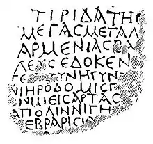 4th century inscriptions of Tiridates II of Armenia rewarding Hrodomithr the new city of Nig. Found in Aparan.