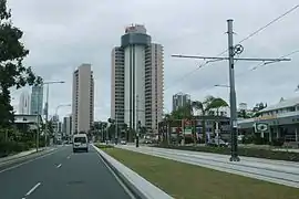 | Gold Coast Highway at Second Avenue looking north towards Surfers Paradise, featuring the Light Rail in the median | |