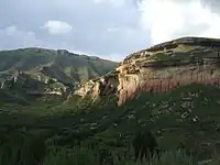 The park is 320 km (200 mi) from Johannesburg and is close to the villages of Clarens and Kestell, in the upper regions of the Little Caledon River.[4] The park is situated in the Rooiberge of the eastern Free State, in the foothills of the Maluti Mountains. The Caledon River forms the southern boundary of the park, as well as the border between the Free State and Lesotho. The elevation ranges from a 1,800 m (5,900 ft) plateau in the north to heights of 2,700 m (8,900 ft) in the south.[9] The highest peak in the park (and also in the Free State) is Ribbokkop at 2,829 m (9,281 ft) above sea level.[6]