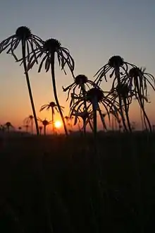 Utilized for hay since European settlers first arrived, prairie restoration at Golden Prairie began in the early 1970s after it was purchased by the Missouri Prairie Foundation (MPF).[4] This has included the use of controlled burns to stimulate native prairie vegetation, the removal of trees, and the control of invasive exotic plants.[2][3] In May 1975, Golden Prairie was declared a National Natural Landmark by the National Park Service. In 2002, MPF purchased two adjacent tracts totaling 310 acres and they are being restored. In 2015, the original 320-acre portion of Golden Prairie was designated the Golden Prairie Natural Area and is included in the Missouri Natural Areas program, a designation reserved for only the highest quality natural landscapes. A history of Golden Prairie was published in the summer 2015 issue of the Missouri Prairie Journal (Vol. 36, No. 2). [5]