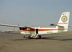 Aero Commuter, founded in December 1967 and based in Long Beach, operated flights between Long Beach, Los Angeles International Airport (LAX), Avalon, Burbank, and Fullerton. Aero Commuter operated de Havilland Canada DHC-6 Twin Otter STOL capable aircraft. It also acquired Catalina Air Lines which had been founded in 1953 as Avalon Air Transport. By 1968 service had expanded to include Apple Valley, Bakersfield, El Monte, Ontario, Oceanside, Palm Springs, Palmdale, San Diego, and Santa Ana. In 1969, it merged with Skymark Airlines (a Sacramento-based charter and commuter airline founded in February 1968 that also operated the DHC-6 Twin Otter) and Cable Commuter Airlines (an Upland general aviation concern based at Cable Airport that had entered the scheduled commuter airline business in 1968 via a hub at Los Angeles International Airport (LAX) with flights to such southern California destinations to Burbank, Colton, Inyokern, Ontario, Oxnard, Palmdale, Palm Springs, Santa Ana (Orange County Airport), Santa Barbara and Santa Maria as well as service to Lake Havasu City in Arizona with all flights operated with DHC-6 Twin Otter aircraft).[1] Upon the demise of the original Golden West Airlines (see above) in early 1969, Aero Commuter acquired several assets from Golden West, including its name. Golden West also briefly operated jet service with the HFB 320 Hansa Jet, a West German manufactured business jet configured with ten passenger seats which the airline flew in scheduled service from Burbank Airport (BUR, now Bob Hope Airport) to Santa Barbara (SBA) and Palm Springs (PSP) in 1969.[2]