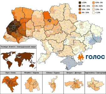 In the October 2020 Ukrainian local elections, Voice had some local success, having led its factions to the Lviv Oblast Council, to the city councils of Kyiv, Lviv, Cherkasy, and a number of other city councils, including even in the Donbas.[33] The party's mayoral candidate made it to the second round of the election in Cherkasy, which he lost.[33][34] The party failed to get into the Top-10 of parties that won the most seats in the election (10th place on this list was the Radical Party of Oleh Liashko who won 1.62% of the available seats, which was 535 seats).[35] The party's mayoral candidate for Kyiv, showman Serhiy Prytula, failed to win in the city, coming third with less than 8% of the vote.[36] In June 2021, he quit the party, claiming it had "moved so far away from our initial principles."[37]