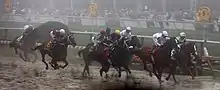 Good Magic broke well and settled near the rail behind the early leaders, Solomini and U S Navy Flag, with The Tabulator racing alongside. Rounding the final turn, Solomini moved to the lead as U S Navy Flag started to tire. With U S Navy Flag in front of him and The Tabulator on his outside, Good Magic's jockey, José Ortiz, decided to wait rather than try to squeeze by on the rail, having been warned by Brown that the inside of the track was not playing well.[13] When a gap opened, Good Magic split horses, moved to the outside and "zoomed past" Solomini on his way to a 4+1⁄4-length victory.[14] Good Magic became the first horse to ever break his maiden at the Breeders' Cup.[15]