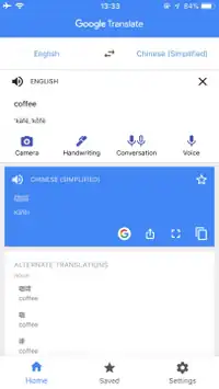 Screenshot ![]() A screenshot of the iOS app of Google Translate, showing an English translation of "Coffee" to Simplified Chinese "咖啡" or "Kāfēi" | |||||