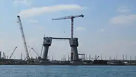 Construction began on July 17, 2018 with groundbreaking by Minister of Infrastructure Amarjeet Sohi and Michigan Governor Rick Snyder.[50][51] On September 28, 2018, the WDBA announced the project would cost CA$3.8 billion to construct,[52] part of a CA$5.7 billion contract with Bridging North America.[49] The bridge was to be completed by the end of 2024.[52]