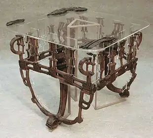 The inlaid table was thus decorated with apotropaic and magical imagery, suggesting that it may have had a ritual function. It was also a practical, portable banquet table, with four handles and a tray-shaped top. Boxwood was used for the frame and legs, juniper for the inlay, and walnut for the table top. In 1983, the table was reconstructed for display in the Museum of Anatolian Civilizations, where it could be seen assembled for the first time in 2700 years. The mount was refurbished and the display reinstalled in 1989.[8]