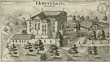 Hopfenbach is a hilltop castle. The Romanesque square keep was first expanded with the addition of Gothic perimeter towers and the eastern wing. During the Habsburg–Ottoman wars the entire complex was surrounded with a defensive wall, reinforced with round towers. During the Renaissance, arcaded hallways were added to the inner courtyard and outbuildings were constructed in the lower courtyard. The final result was an extensive defensive complex, with two concentric defensive walls closing off the access to the main building, perched on the raised ridge. A walled garden was laid out east of the complex, separated from the main gate by a dry moat.[5][6]