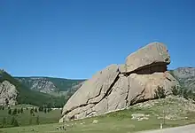 Gorkhi-Terelj National Park (Mongolian: Горхи-Тэрэлж [ɡɔrxi tɛrɛɮʃ], creek-rhododendron) is one of the national parks of Mongolia. The Terelj tourist zone has a number of "tourist camps" (Mongolian: жуулчны бааз, juulchny baaz). It is connected with Ulaanbaatar by a paved road (main road to the East #A0501 Baganuur-Öndörkhaan direction, 37 km from Ulaanbaatar city center, left turn to the branch #A24, 5 km later road crosses Tuul River and the National park territory begins). The road comes to the Gorkhiin Davaa (Mongolian: Горхийн даваа) pass. Most of the tourist camps and tourist attractions are before this pass. The road then ends at the settlement of Terelj, which features small shops and restaurants. The Terelj settlement is located in the valley of the Terelj River (Terelj Gol), approximately 66 km from the Ulaanbaatar city center. The national park tourist zone is formally in Nalaikh düüreg (district) part of Ulaanbaatar municipality, the rest of the protected zone beginning to the north of the Terelj River, is located in Mongolia's Töv Province (Töv aimag).[1]