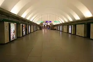 Gostiny Dvor (Russian: Гости́ный двор) is a station on the Nevsko–Vasileostrovskaya Line of the Saint Petersburg Metro. It was designed by architect C.G. Mayofis, E.S. Belyat, A.K. Andreyev, Ya.E. Moskalenko and C.P Schyukin and opened on November 3, 1967. It has two exits - one at the intersection between the Griboyedov Canal and Nevsky Prospect and another inside the northern side of the Gostinyi Dvor mall. The latter exit has an entrance that allows the commuters to enter the mall directly. The station also linked to the Nevsky Prospekt metro station via a transfer corridor and a set of escalators. The station is the busiest station on the line and one of the busiest stations in the entire St. Petersburg Metro.