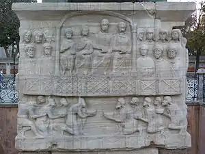 ![]() The Obelisk of Theodosius (389) depicting Honorius, Arcadius, Theodosius I, and Valentinian II (top center). Court officials surround their sides, and on the lower tier Persians (left) and Goths (right) present gifts in supplication[1][2][3] | |||||||