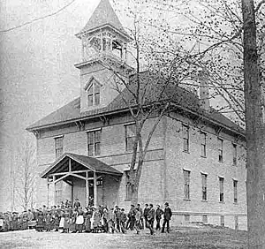 In 1835 citizens of Bethel, Maine, formed an organization as trustees of the Bethel High School. A hall was fitted up for a schoolroom, and N. T. True was employed as principal. Encouraged by their success, the trustees reorganized and obtained a charter for an Academy, which by act of the Legislature on January 27, 1836, was incorporated as Bethel Academy. A building was erected, Isaac Randall was the first instructor, and the school opened for its first term on the second Wednesday of September, 1836.[1]