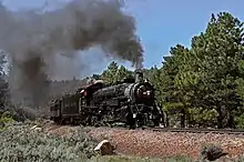 At a cost of $1.6 million, the rebuild on No. 4960 took thirty-months over a three-year period to complete.[32][42] In May 1996, No. 4960 was test-fired, and two months later, on July 27, the locomotive emerged from the shop and pulled its first train for GCR.[42][38][43] Later that year, on the weekend of October 5-6, the Grand Canyon Chapter of the National Railway Historical Society (NRHS) hosted a series of photo charters to serve as No. 4960's formal GCR debut.[44] In August 2002, No. 4960 took part in that year's NRHS Convention on GCR, with the O-1A briefly running alongside visiting locomotive Santa Fe 3751.[45][46]