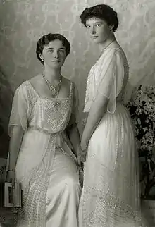 Before World War I, there was some discussion of a marriage between Olga and Prince Carol of Romania. In 1914, Foreign Minister Sergey Sazonov advocated the match because he wanted to ensure that the Romanian royal family would support Russia in case of a future conflict.[62] Nicholas and Alexandra saw the benefits of the match, but they insisted that "the grand duchess's marriage ... should take place only as the result of a much closer acquaintance between the young people and on the absolute condition of their daughter's voluntary agreement to it."[63] In March 1914, Crown Prince Ferdinand of Romania, Crown Princess Marie of Romania, and Prince Carol of Romania visited the Romanovs in St. Petersburg. Despite going on walks and dinners with each other, Olga and Carol seemed uninterested in each other. During a visit to Romania in the spring of 1914, Olga and Carol were uninterested in each other and did not speak to each other.[64] Crown Princess Marie of Romania noted that Carol was "not enamored of Olga's broad, plain face and brusque manner."[65] She judged that Olga's face "was too broad, her cheekbones too high,"[66] and she told her mother that all of the grand duchesses "were not found very pretty."[67] Marthe Bibesco, who was with the Romanian party, heard a rumor that the grand duchesses had "decided... to make themselves as ugly as they could.... so that Carol should not fall in love with any of them."[68]