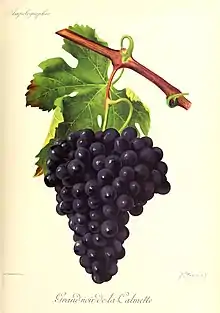 Grand Noir de la Calmette (or simply Grand noir) is a red teinturier grape variety that is a crossing of Petit Bouschet and Aramon noir created in 1855 by French grape breeder Henri Bouschet at his vineyard in Mauguio in the Hérault department.[1] The grape was named after the breeding station Domaine de la Calmette. As a teinturier, Grand noir is often used to add color to wines that it is blended into but is paler than other choices such as Alicante Bouschet. The vine tends to bud late and has a high productivity but with some susceptibility to the viticultural hazard of powdery mildew.[2]