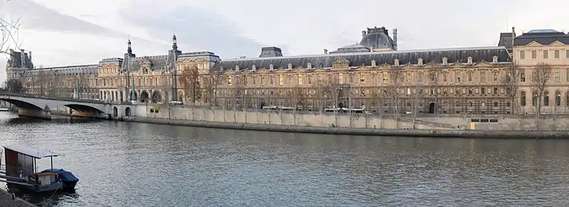 This unusually long wing was constructed beginning in 1595 on the initiative of King Henry IV[2] and was completed in late 1607.[3]: 69 It contained an elevated enclosed passageway linking the old Louvre Palace with the Tuileries Palace. The passageway was used for various purposes until the creation of the Louvre Museum in 1793, when it became the exhibition gallery it remains to this day.[4] Originally 460 meters long, the room was reduced to its current length of 288 meters following the remodeling of its western section in the 1860s in the wake of Napoleon III's Louvre expansion.[5]