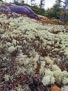 About fifteen species of the heather family are observable in the park.[21] Their flowering extends from the beginning of June until the end of the summer. One of the most easily observable flowers is probably the narrow-leaved Kalmia (Kalmia augustifolia), which has pink saucer-shaped flowers. The park is also home to Labrador tea (Rhododendron groenlandicum), a few varieties of [cranberry] (Vaccinium spp.) that produce blueberries and cranberries, the pirole with one flower (Moneses uniflora), wintergreen hispid (Gaultheria hispidula), glaucous Andromeda (Andromeda polifolia var. glaucophylla) and the leatherleaf or cassandra (Chamaedaphne calyculata). A second family of plants is very abundant in the park, that of the lichen which is represented in the Parc des Grands-Jardins by 200 different species. Different species colonize different parts of the park. Some lichens are more adapted to the soil while others colonize trees or rock walls. There are different species of crustacean and foliaceous lichens that grow mainly on rocks in the Bear Mountains and Swan Lake. Lichens of the Bryoria and Usnea type are found on mature trees in the boreal forest. Finally, fruiticulous lichens of the genus Cladoni grow directly on the ground. Lichens are an important component of the ecosystem since they are the main source of food for certain species, especially for woodland caribou in winter.[22]