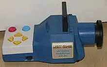 The projector-based game system was developed by Hong Kong company Playtime Products, and was released in other regions where it is known as the Light Games Color LCD Projector. It was Playtime's only console to be sold. Fantastiko released the "PROJECTOR MEGA VIDEO GAME Color LCD system" in Italy in 1988, while Grandstand rebranded it as "Light Games LCD Colour Projection System" for the UK, and Hunter Caesar Toys (Defunct in 1996) released it for Australia.[33] It was a tabletop projector based machine with built-in controller, that ran games on small cartridges with LCD windows. Light would be directed through the LCD window and magnified onto a wall. The window was painted with a semi-transparent background and the black LCD display would block the light from passing through. This provided 'big screen' entertainment and was a novelty at the time. The visual design and 'animation' being projected from these game carts were somewhat reminiscent of Nintendo's popular Game & Watch series of electronic handheld game devices that consisted of a segmented LCD display being pre-printed with an overlay. The machine ran from D sized batteries and was available for sale in various parts of Europe including the UK.[34] 13 games were developed for it.[35]
