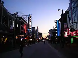 Prior to the establishment of the current Entertainment District, in what is now the Granville Mall was home to a number of movie theatres, which gave that stretch of Granville Street the nickname "Theatre Row" for many years. The closure of those theatres over the years (and the conversion of some of them into their current nightclub forms), however, has left no more movie theatres still operating in the former Theatre Row area as of November 4, 2012 (the date of the closure of the last remaining theatre there, the Granville 7 Cinemas).