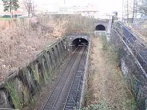 ![]() Trackbed of the disused spur line near the site of the former station, over the cutting of the replacement line | |