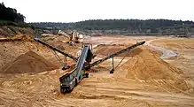 Colloquially, the term gravel is often used to describe a mixture of different size pieces of stone mixed with sand and possibly some clay.[1] The American construction industry distinguishes between gravel (a natural material) and crushed stone (produced artificially by mechanical crushing of rock.)[2][3][4]
