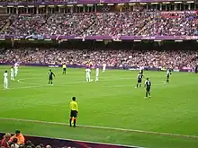Great Britain were placed in group A for the Olympic tournament prior to the draw.[56] The draw was held on 24 April 2012 and added Uruguay, United Arab Emirates and Senegal to Great Britain's group.[57] The final 18-man squad for the Olympic Games was announced on 2 July 2012.[58] A pre-tournament training camp was held in Marbella, Spain.[59] This included a training match against Mexico, which Mexico won 1–0. All players in the squad played for between 45 and 75 minutes.[59] The team then played one official friendly match, against Brazil at the Riverside Stadium in Middlesbrough on 20 July,[60] which was won 2–0 by Brazil.[61]