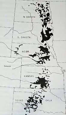 The Great Plains Shelterbelt was a project to create windbreaks in the Great Plains states of the United States, that began in 1934.[1] President Franklin D. Roosevelt initiated the project in response to the severe dust storms of the Dust Bowl, which resulted in significant soil erosion and drought. The United States Forest Service believed that planting trees on the perimeters of farms would reduce wind velocity and lessen evaporation of moisture from the soil. By 1942, 220 million trees had been planted, covering 18,600 square miles (48,000 km2)[2] in a 100-mile-wide zone from Canada to the Brazos River. Even as of 2007, "the federal response to the Dust Bowl, including the Prairie States Forestry Project which planted the Great Plains Shelterbelt and creation of the Soil Erosion Service, represents the largest and most-focused effort of the [U.S.] government to address an environmental problem".[3][4]