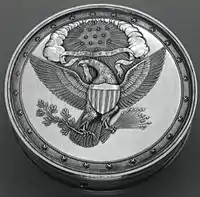 1825 Starting with the ratification of the Treaty of Ghent, the United States began to use pendant seals on treaties, where the seal is impressed onto a separate wax disc and attached to the document with cords. Although the reverse side of the seal was designed for this purpose, a die was still not made but rather the obverse was impressed on one side only using the regular die. However, this did not conform to the European tradition of using much larger seals for treaties. To address this, Seraphim Masi of Washington D.C., was asked to design a larger seal specifically for treaties.[13] Masi produced a quite different design, showing a much more realistic (and uncrested) eagle, turned somewhat to the side. He also added fruits to the olive branch, changed the shape of the shield, and depicted the crest differently. It was 4+1116 inches (11.9 cm) in diameter.[13]