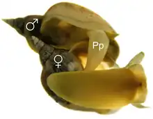 Lymnaea stagnalis is a simultaneously hermaphroditic species and can mate in the male and female role, but within one copulation only one sexual role is performed at a time.[7] Lymnaea stagnalis perform more inseminations in larger groups and prefer to inseminate novel over familiar partners. Such higher motivation to copulate when a new partner is encountered is known as the Coolidge effect and has been demonstrated in hermaphrodites firstly in 2007.[7]