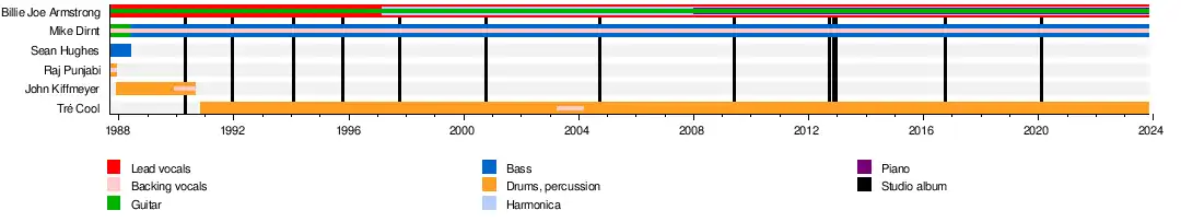 Green Day is an American rock band formed in the East Bay of California in 1987 by lead vocalist and guitarist Billie Joe Armstrong, together with bassist and backing vocalist Mike Dirnt. For most of the band's career they have been a power trio[4] with drummer Tré Cool, who replaced John Kiffmeyer in 1990 before the recording of the band's second studio album, Kerplunk (1991). Before taking its current name in 1989, Green Day was called Blood Rage, then Sweet Children and they were part of the late 1980s/early 1990s Bay Area punk scene that emerged from the 924 Gilman Street club in Berkeley, California. The band's early releases were with the independent record label Lookout! Records. In 1994, their major-label debut Dookie, released through Reprise Records, became a breakout success and eventually shipped over 10 million copies in the U.S. Alongside fellow California punk bands Bad Religion, the Offspring, Rancid, NOFX, Pennywise and Social Distortion, Green Day is credited with popularizing mainstream interest in punk rock in the U.S.