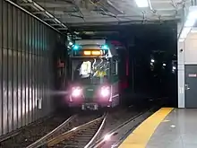 The Green Line is a semi-metro system[4][5] (form of light rail) run by the Massachusetts Bay Transportation Authority (MBTA) in the Boston, Massachusetts, metropolitan area. It is the oldest MBTA subway line, and with tunnel sections dating from 1897, the oldest subway in North America.[6] It runs underground through downtown Boston, and on the surface into inner suburbs via six branches on radial boulevards and grade-separated alignments. With an average daily weekday ridership of 137,700 in 2019, it is the third most heavily used light rail system in the country.[1] The line was assigned the green color in 1967 during a systemwide rebranding because several branches pass through sections of the Emerald Necklace of Boston.[7][8][9]