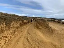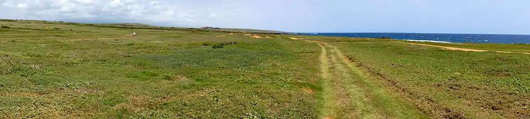 The beach is located about 3 miles (5 km) east of Ka Lae (known as South Point) on the island of Hawaiʻi.[17] It is surrounded by pasturelands and is only legally accessible by foot. The paths are rugged (due to both illegal vehicular traffic and erosion) and the land owner, the Department of Hawaiian Home Lands, has attempted to restrict vehicular traffic in the area since 2016.[18] However, these attempts to restrict the illegal shuttling of tourists through the exceptionally fragile ecosystem have failed due to the demand created by tourists to avoid the 2.9 mile walk to the beach.[19] The tourists pay for illegal shuttles which have created ruts in the soil that reach well over 8 feet deep as shown in the photo below from December 20, 2020.