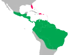 Native range in green (does not include the recent colonization of Anguilla in 1995 following hurricanes); introduced range in red