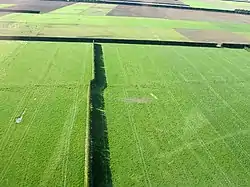 ![]() The Greendale Fault photographed looking north, about 12 hours after the Darfield earthquake. The hedgerow and tractor tire tracks in the paddocks have been horizontally offset by about 3.5 meters | |