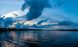 Grindstone Lake is a large freshwater lake located in Dell Grove Township, Pine County, in east-central Minnesota approximately 6.5 miles (10.5 km) west of Sandstone, Minnesota. The lake is roughly oval shaped being approximately 2 miles (3.2 km) in length north to south and 0.5 miles (0.80 km) east to west, and a maximum depth of 153 feet (47 m). The lake has several small streams that drain the area wetlands and is considered the headwater for the Grindstone River. The lake's name is a translation from the Ojibwe zhiigwanaabikokaa-zaaga'igan (Lake abundant with grind stones). Sandstone taken from near the lake was used to make sharpening stones.[2] The lake, North Fork Grindstone River and the lower course of the Grindstone River are depicted on the 1757 Mitchell Map.