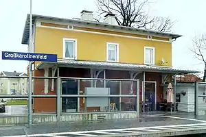 Großkarolinenfeld station is a railway station in the municipality of Großkarolinenfeld, located in the Rosenheim district of Bavaria, Germany. It has two tracks, which are located next to two side platforms, which are connected by an underpass.