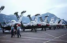 During 1956, the Panther was withdrawn from frontline combat service, having been displaced by new fighter aircraft, including its swept-wing Cougar derivative.[13][31] However, the type remained active in secondary roles, such as for training and with U.S. Naval Air Reserve and U.S. Marine Air Reserve units, until 1958. The Navy's Blue Angels flight demonstration team used the Panther for four years, beginning in 1951. The Panther was the Blue Angels' first jet.[32] Some Panthers continued to serve in small numbers into the 1960s.[33] From September 1962, surviving operational Panthers were designated F-9 within the new combined US tri-service designation system.[34]