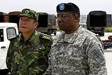 U.S. Army Brig. Gen. Charles W. Hopper (right), defense attache at the United States Embassy Beijing, observes relief operations with Senior Captain Guan Youfei, deputy director for the Chinese Defense Ministry's foreign affairs office in 2008.