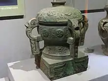 A gui is a type of bowl-shaped ancient Chinese ritual bronze vessel used to hold offerings of food, probably mainly grain, for ancestral tombs. As with other shapes, the ritual bronzes followed early pottery versions for domestic use, and were recalled in later art in both metal, pottery, and sometimes stone. The shape changed somewhat over the centuries but constant characteristics are a circular form (seen from above), with a rounded, wide, profile or shape from the side, standing on a narrower rim or foot. There are usually two, or sometimes four, handles, and there may be a cover or a square base (or both).