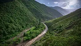 The Guloykhi river originates in the eastern part of mountainous Ingushetia. It flows west along a mountain valley near several medieval tower settlements, most notably Gul, Läzhg, Qoyrakh, Abali, Vovnushki, Koki, and flows into the Assa near Puy and Tkhaba-Yerdy.[3] A forest mainly covers the left bank of the river.[4] The speed of the flow is 2.2 m/s. The mouth of the river is located 103 km along the right bank of the Assa at an altitude of 1112 meters above sea level.