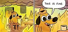 A 2013 Gunshow strip titled "On Fire" features an anthropomorphic dog (dubbed "Question Hound")[5][6] drinking tea in a room that is burning down. Despite its own body catching fire and beginning to melt, the dog remains perfectly calm throughout the six-panel strip, saying lines such as "That's okay, things are going to be okay." The first two panels of the strip, featuring the dog simply sitting in the blazing room saying "this is fine", became a popular internet meme. The dog's demeanor, described as "somewhere between bemused acceptance and outright denial" by Slate Magazine's Jacob Brogan, proved popular with its full context removed. The sentence "this is fine" was described by The Verge's Chris Plante as a "shorthand for when a situation becomes so terrible our brains refuse to grapple with its severity".[7][8]