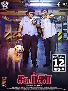 The first look poster of the film was unveiled by actor Sivakarthikeyan on 15 September 2018 and the first look poster itself revealed that the film will be a summer release.[3][4] The film titled as Gurkha implies that the film is based on security guards, and it is played by Yogi Babu. The movie was produced by Kishore Thallur under 4 monkeys studios. The filmmakers also reportedly hired Elyssa Erhardt, a Canadian model who earlier played a small acting role as an assistant to Sundar Ramaswamy (played by actor Vijay) in Sarkar). Elyssa will play the female lead as a foreign ambassador, along with a dog.[5][6] The film also marks Elyssa's acting debut in Kollywood.[7] The shoot wrapped in around early January 2019, and the reports confirmed that the film will be released in or around April 2019.[8]