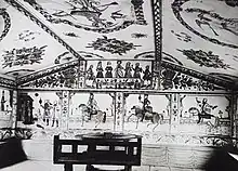 Skansen bought the main building from the Karls farmhouse in Tjärnmyra in Delsbo parish in 1927. Since the building itself turned out to be in awful condition, only decoratively painted rolls of linen weave were recovered from the main hall. They were eventually re-used to decorate the 'Västerängsstuga' at Skansen's Delsbo farmhouse.[21] The ceiling planks boast painted ornaments and angels in Reuter's style, completed in 1773.[21][22]
