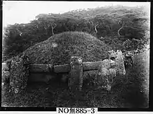He developed a serious disease in July 975 (fifth month of the Lunar calendar) and died just a few days later at the age of 50.[2] He was given the posthumous name of "Hongdoseon-yeolpyeongse sukheon-ui hyoganghye daeseong dae-wang" (Korean: 홍도선열평세숙헌의효강혜대성대왕; Hanja: 弘道宣烈平世肅憲懿孝康惠大成大王),[14] while his temple name Gwangjong means "shining emperor". His tomb, called Heolleung (Korean: 헌릉; Hanja: 憲陵), is located on the north side of Mount Songak, in Kaepung County, North Korea. The site inspection in 1916 found a severely damaged tomb, but the stairway and the foundation stone are preserved.[15][16]
